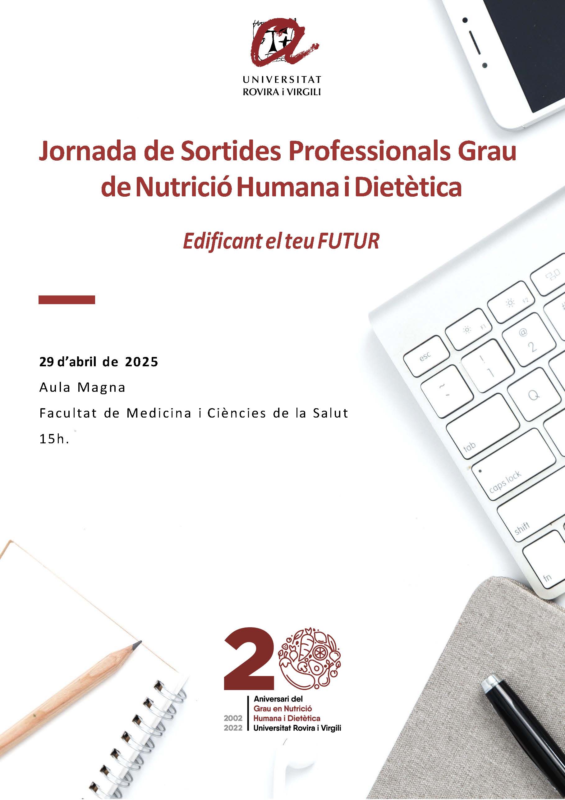 Jornada de Sortides Professionals el dia 29 d'abril a les 15h a l'Aula Magna de la Facultat de Medicina i Ciències de la Salut. Aquesta activitat està destinada als estudiants de 4t curs del Grau en Nutrició Humana i Dietètica.