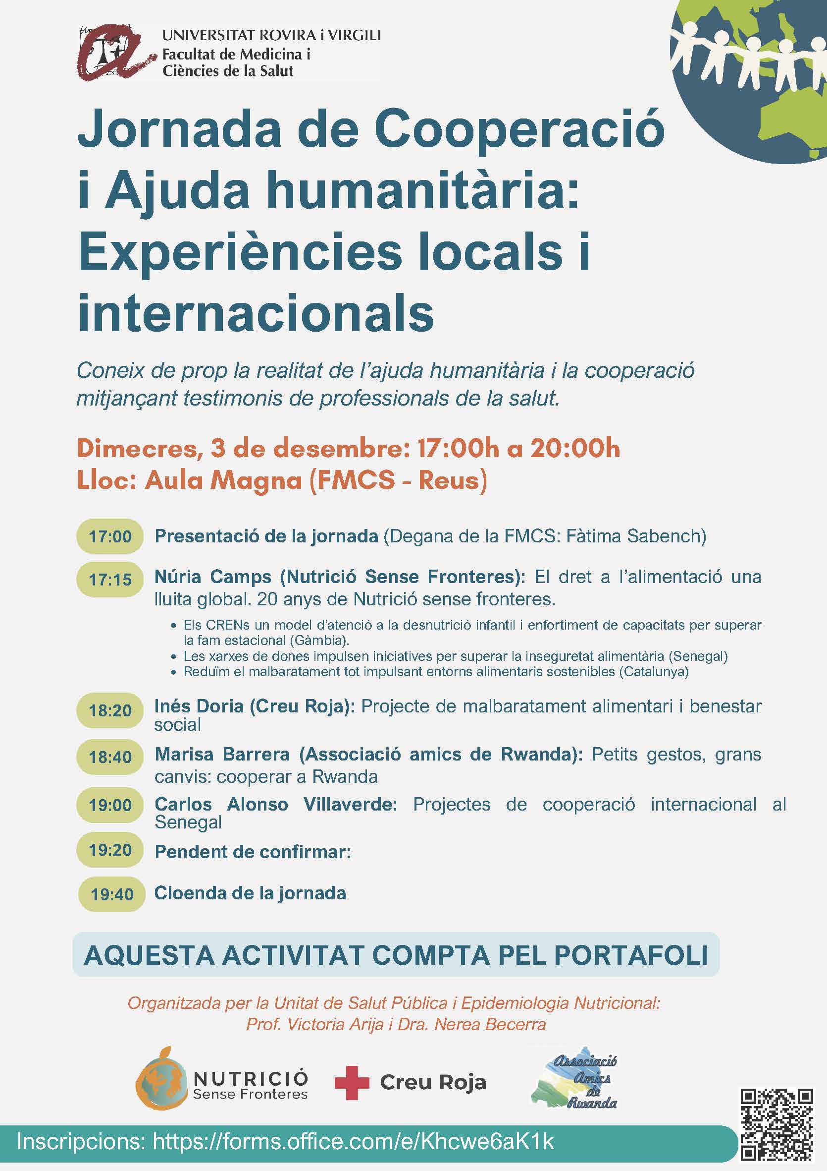 Jornada de Cooperació i Ajuda Humanitària: Experiències locals i internacionals, organitzada per la Unitat de Salut Pública i Epidemiologia Nutricional del Departament de Ciències Mèdiques Bàsiques.