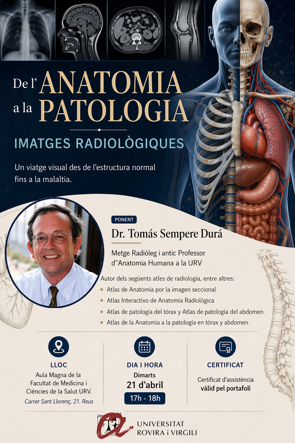 Conferència "De l'anatomia a la patologia. Imatges radiològiques" a càrrec de Tomás Sempere Durá, professional de reconegut prestigi com a metge radiòleg i com a docent, autor d'excel·lents atles, molt didàctics, d'anatomia i patologia radiològica.