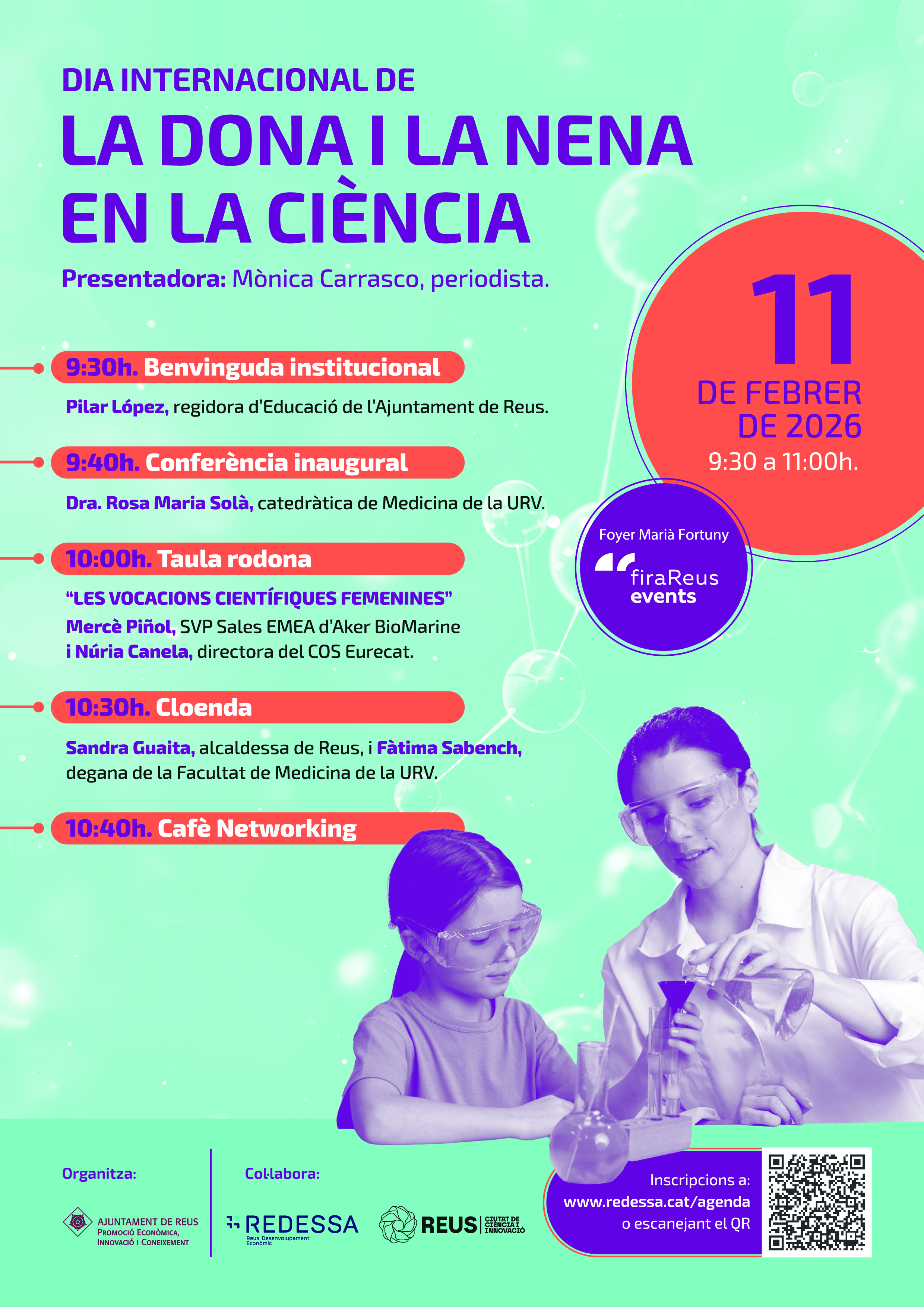 Jornada amb motiu de la celebració del Dia Mundial de la Dona i la Nena en la Ciència, organitzada per l'Ajuntament de Reus. L'acte se celebrarà l'11 de febrer de 9:30h a 11:00h a firaReus Events. Inscripcions..