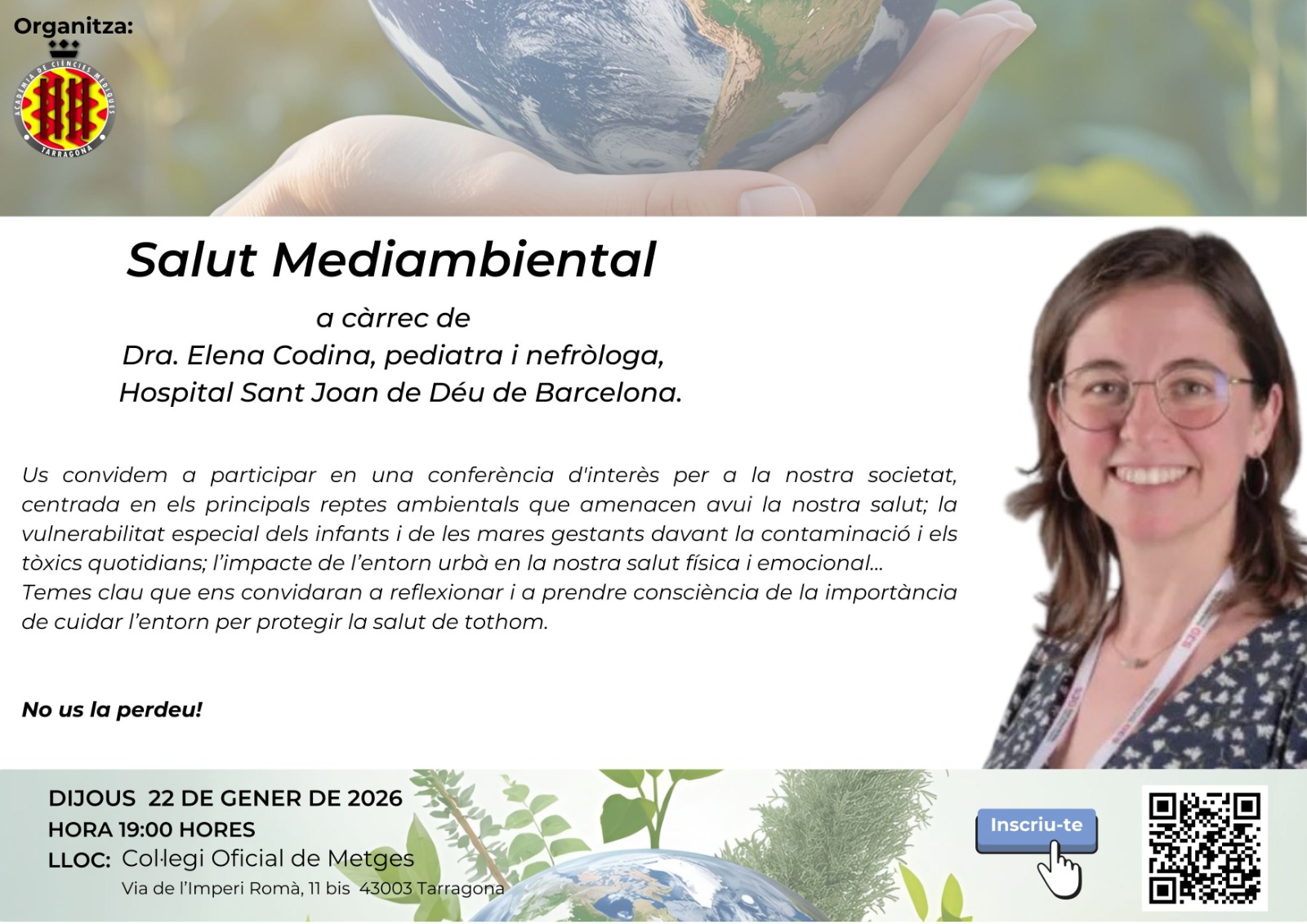 Conferència a càrrec de la Dra. Elena Codina Sampera, organitzada des de l'Acadèmia de les Ciències Mèdiques de Tarragona. L'acte tindrà lloc el dia 22 de gener de 2026 a les 19:00 hores a la Sala d'Actes del Col·legi de Metges de Tarragona. Inscripcions.