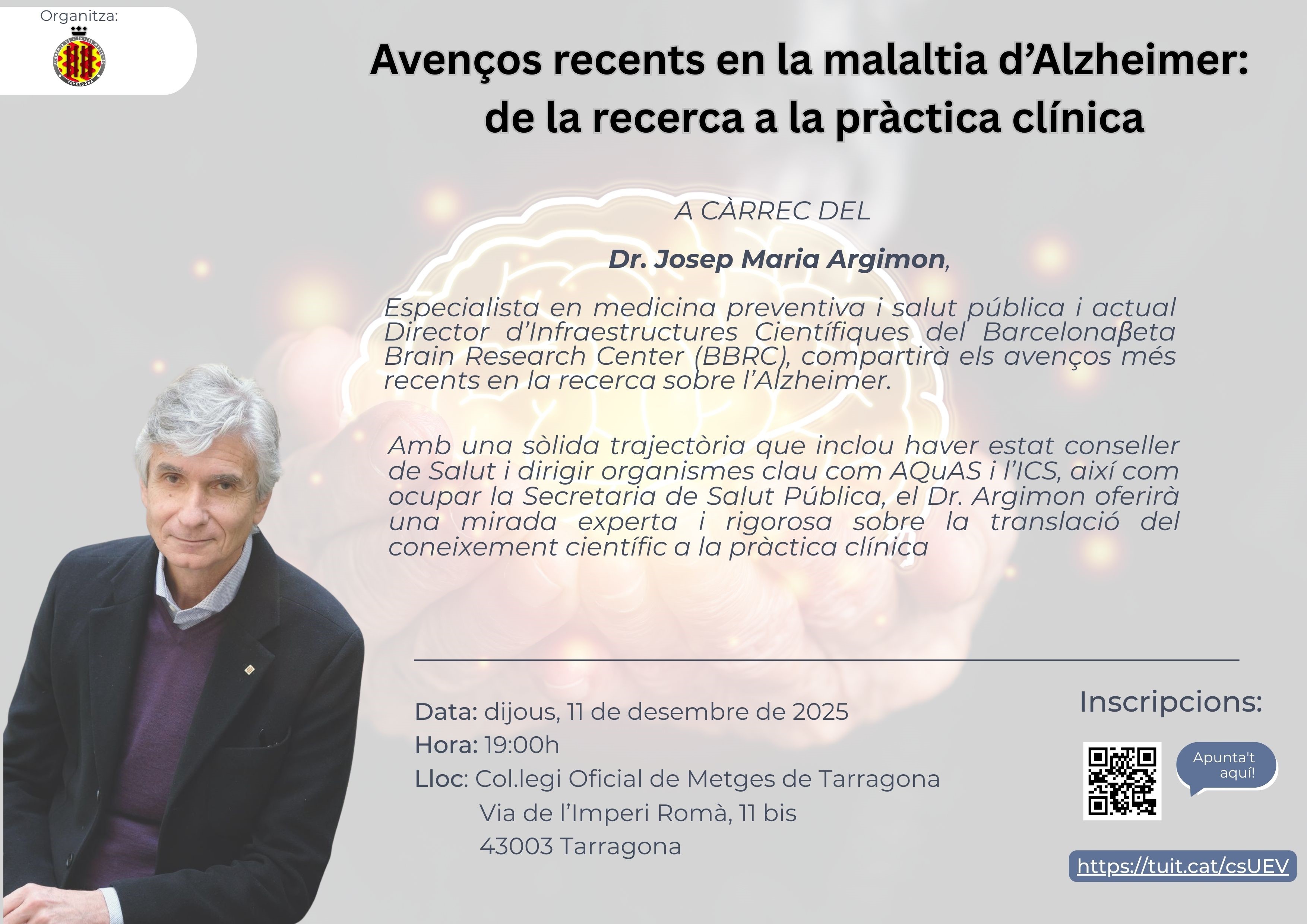 Conferència a càrrec del Dr. Josep Maria Argimon, organitzada des de l'Acadèmia de les Ciències Mèdiques de Tarragona. L'acte tindrà lloc dijous 11 de desembre de 2025 a les 19:00 hores al Col·legi Oficial de Metges de Tarragona (Via de l'Imperi Romà 11, 43003 Tarragona. Inscripcions a l'enllaç.