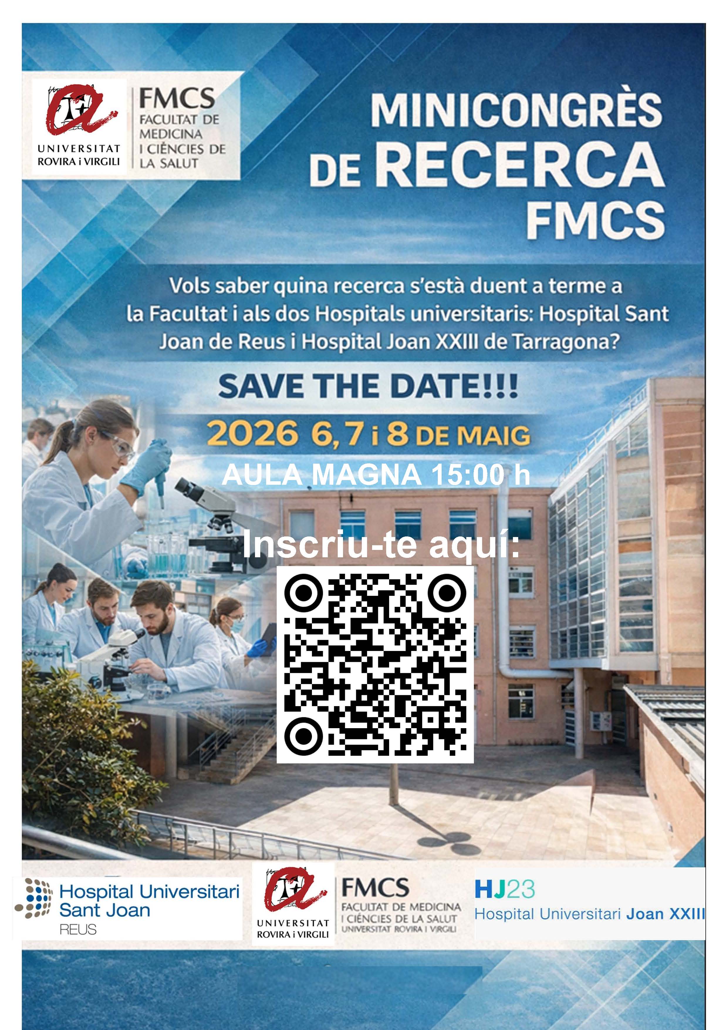 El MINICONGRÉS DE RECERCA ALUMNE INTERN se celebrarà els dies 6, 7 i 8 de maig a les 15:00h a l'Aula Magna de la Facultat de Medicina i Ciències de la Salut, amb la presentació final dels treballs de recerca del Programa Alumne Intern 2026.